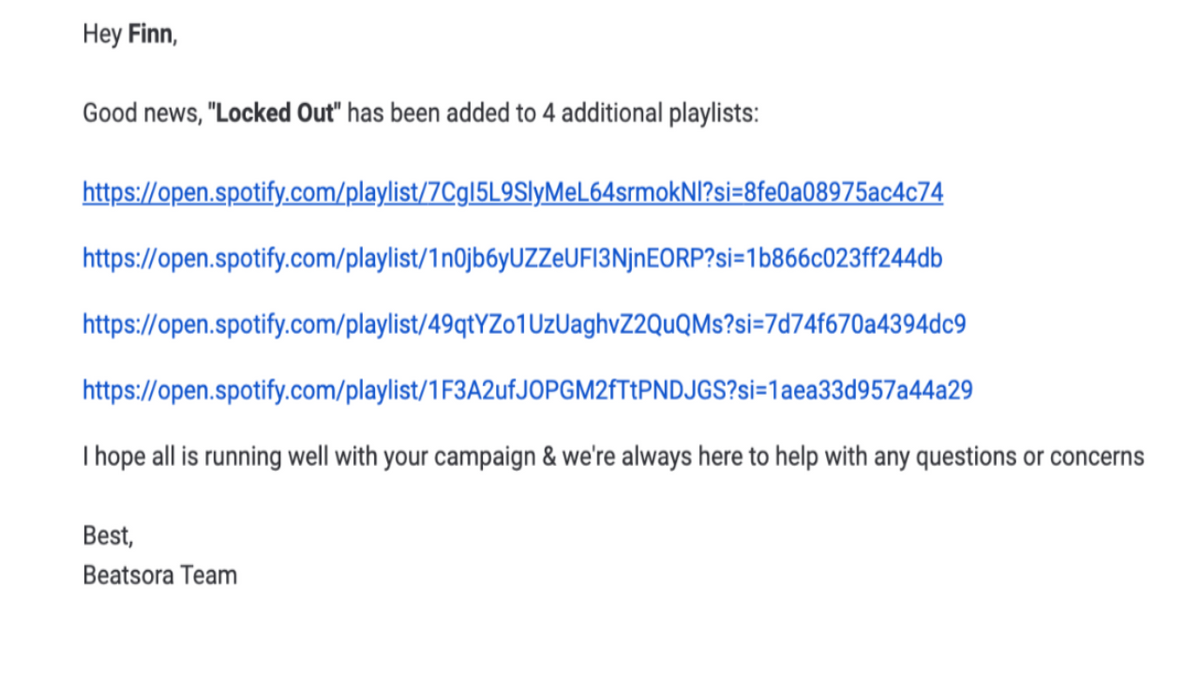 I recently used Beatsora’s playlisting service with a goal of reaching 5,000 streams, and not only was that goal met it was exceeded.